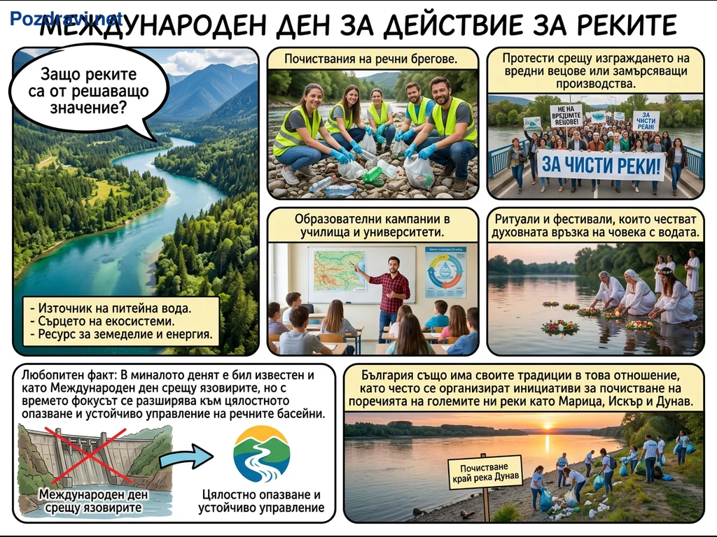 Инфографиката представя Международния ден за действие за реките, подчертавайки тяхното решаващо значение като източник на питейна вода, сърце на екосистеми и ресурс за земеделие и енергия. Тя илюстрира различни дейности за опазване, включително почиствания на речни брегове, образователни кампании и протести срещу замърсяващи производства. Визуалният материал обяснява и еволюцията на деня от борба срещу язовирите към цялостно опазване и устойчиво управление на речните басейни. Отбелязани са и български инициативи за почистване на реки като Марица, Искър и Дунав, както и ритуали, честващи връзката с водата.