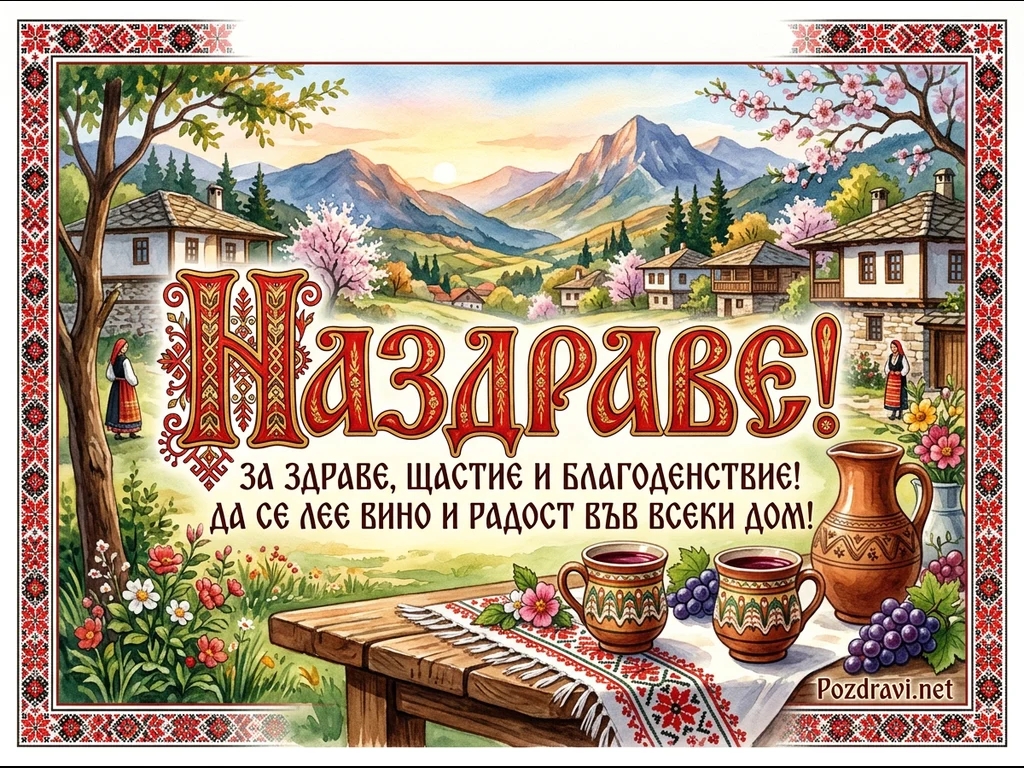 Тази живописна картичка изобразява традиционна българска пролетна сцена с къщи в битов стил, цъфтящи дървета и величествени планини на заден план под залязващото слънце. В преден план, на дървена маса, покрита с бродирана българска покривка, са поставени две керамични чаши с вино, глинена кана и грозде. Две жени в народни носии допълват идиличната атмосфера, а централният надпис 'Наздраве!' пожелава здраве, щастие и благоденствие, с вино и радост във всеки дом. Цялата композиция е обградена от рамка с традиционни български шевици.