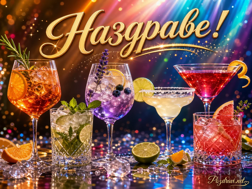 В горната част блести голям златист надпис 'Наздраве!' с елегантни извивки и сияен отблясък. На преден план са подредени пет коктейла в различни чаши, като всеки е в ярък цвят и е украсен с плодове, билки или лед. Вляво се откроява оранжев коктейл с резен портокал и стрък розмарин, а до него има ниска чаша с лайм и свежа мента. В средата стои лилава напитка с боровинки, лимонов резен и стръкче лавандула, която придава изискан и артистичен акцент. Вдясно се виждат светъл коктейл в чаша тип маргарита със сол по ръба, яркочервено мартини с портокалова кора и розова напитка с парче грейпфрут. Фонът е изпълнен с цветни светлинни лъчи, искри и боке ефекти, които създават усещане за бляскав празник и нощно настроение. По масата проблясват кристални орнаменти, цитрусови резени и отражения, които подсилват усещането за лукс и тържественост.