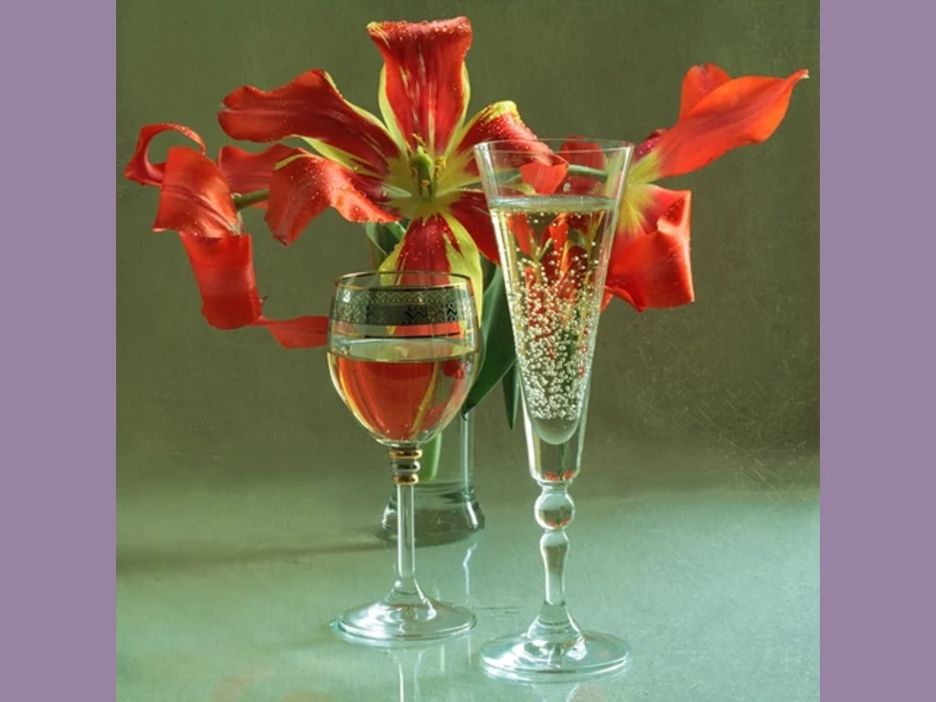Ключови фрази: картичка, наздравица, две, пълни, чаши, бяло, вино, шампанско, ваза, цветя, чувства, любов