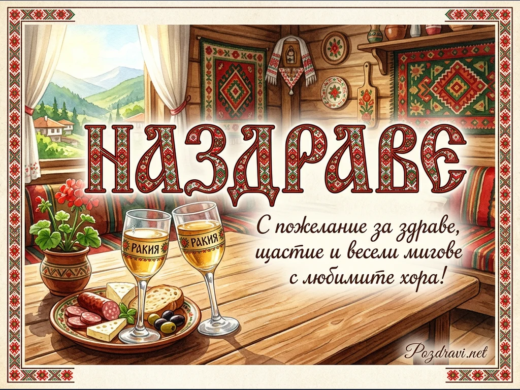 Тази илюстрация е поздравителна картичка с български фолклорни мотиви. Тя изобразява уютна стая с дървени стени, украсени с традиционни килими и бродерии. През прозореца се вижда живописен планински пейзаж с къщи в български стил. На преден план, върху дървена маса, са поставени две чаши ракия, чиния с мезе (колбас, сирене, хляб и маслини) и саксия с мушкато. Централният надпис 'НАЗДРАВЕ' е изписан с декоративни букви, наподобяващи шевица, придружен от пожелание за здраве, щастие и весели мигове.