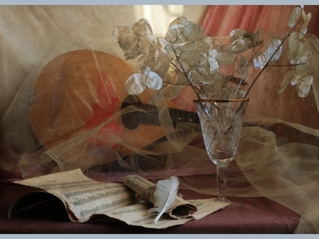 Ключови фрази: Картичка нотни листа музика перо чаша ефирни воали мандолина кристална чаша сухи цветя