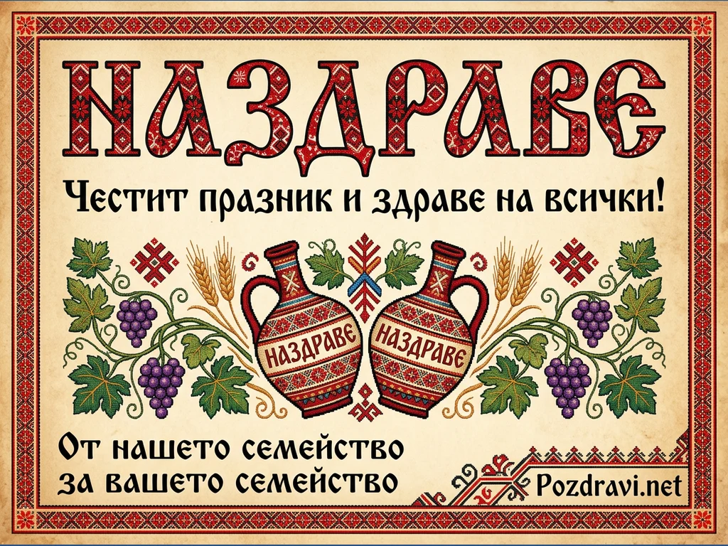 Тази картичка е изпълнена в традиционен български фолклорен стил, наподобяващ шевица, с преобладаващи червени, черни и бежови тонове. Централно е изписано 'НАЗДРАВЕ' с едри, орнаментирани букви, а под него – 'Честит празник и здраве на всички!'. Композицията включва две симетрично разположени кани с надпис 'НАЗДРАВЕ', обградени от лозови клонки с грозде, житни класове и стилизирани фолклорни мотиви. Цялата визия е рамкирана от бордюр с традиционни български шевици, а в долния десен ъгъл е посочен уебсайт Pozdravi.net.