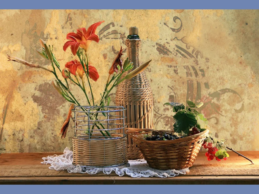 Ключови фрази: картичка, наздравица, плетена, бутилка, вино, касис, панер, ваза, цветя