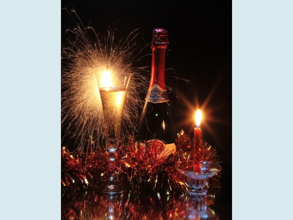 Ключови фрази: Картичка поздрави новогодишна наздравица бутилка шанпанско бенгалски огън запалена свещичка герлянди
