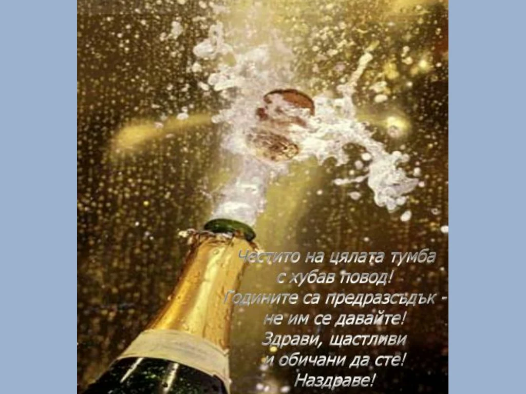 Създадена: 2008-07-26 16:04:57 Категория: Наздраве Ключови фрази: картичка, повод, специален, наздравица, здрави, щастливи, обичани, пенливо, шампанско Честито на цялата тумба с хубавия повод! Годините са предрасъдък - не им се давайте! Здрави, обичани и щастливи да сте! Наздраве!
