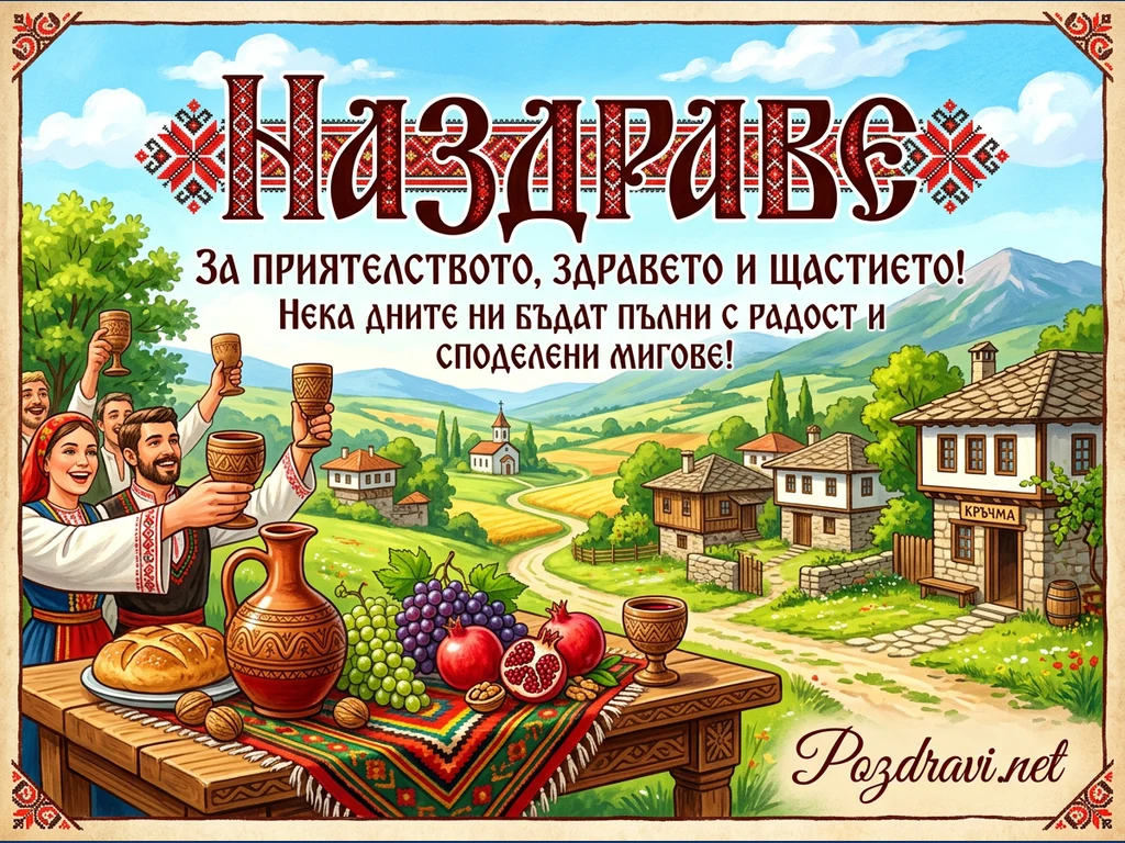 На картичката е изобразена весела компания от хора в традиционни български носии, които вдигат наздравица с дървени чаши. Пред тях е отрупана маса с хляб, грозде, нарове, орехи и глинен съд, покрита с пъстра черга. На заден план се вижда живописно българско село с къщи, църква и зелени поля, водещи към планини под ясно синьо небе. Над сцената е изписано 'Наздраве!' с букви, украсени с шевици, и пожелание за приятелство, здраве и щастие. Цялостната атмосфера е празнична и топла, пресъздаваща духа на българската традиция.