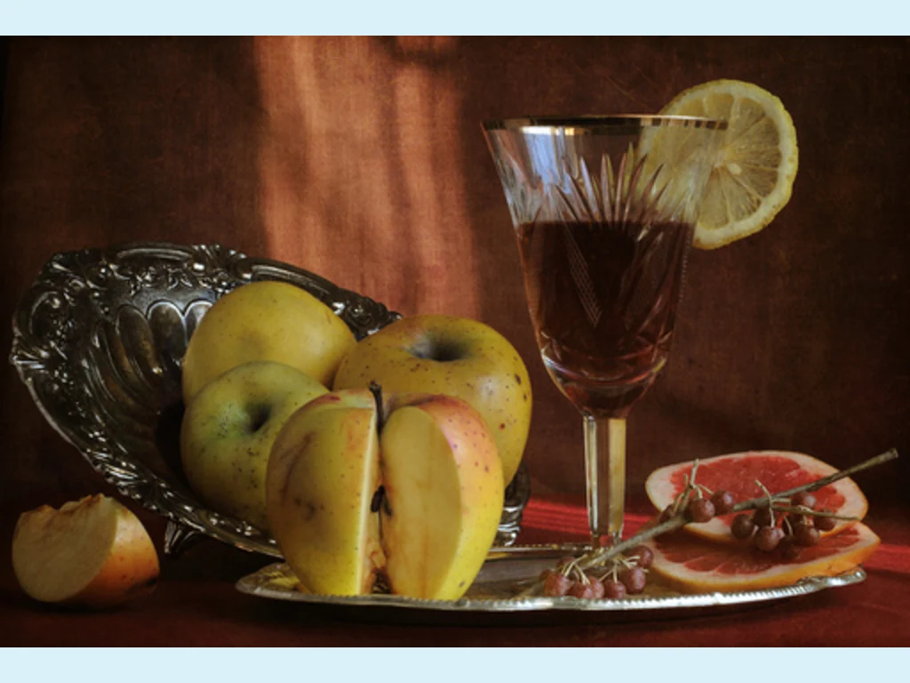 Ключови фрази: Картичка наздравица ябълки червено вино грейпфрут лимон сребърен поднос