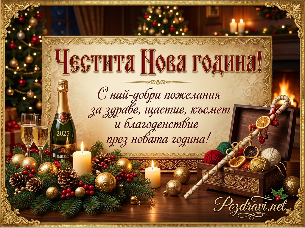 Тази празнична картичка излъчва топла и уютна атмосфера за Нова година. В центъра е разположено златисто пано с надпис 'Честита Нова година!' и пожелания за здраве, щастие, късмет и благоденствие през новата година. Отляво са изобразени бутилка шампанско с година '2025' и две чаши, обградени от коледна украса с елхови клонки, червени плодчета, шишарки и златни топки, осветени от две свещи. Отдясно се вижда отворена дървена кутия с прежда и декоративен жезъл, украсен със сушени портокали. Фонът допълва празничната обстановка с разфокусирана коледна елха и горяща камина.