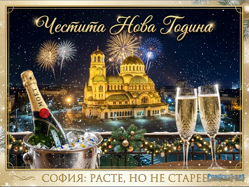 Величествената катедрала 'Свети Александър Невски' в София, осветена през нощта, на фона на празнични фойерверки, озаряващи тъмното небе. На преден план се вижда бутилка шампанско Moët, охлаждаща се в кофа с лед.