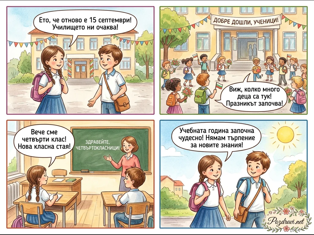 Комиксът показва вълнението и събитията около първия учебен ден, 15 септември, в България. Деца с раници и цветя пристигат пред украсено училище, където ги посреща надпис 'Добре дошли, ученици!'. Вътре в класната стая, учителка приветства четвъртокласниците, а учениците споделят радостта си от новата класна стая и предстоящите знания. Цялата поредица предава празничната атмосфера и ентусиазма за началото на учебната година.