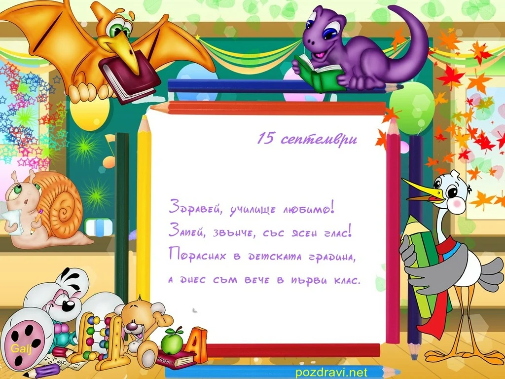Ключови фрази: картичка пожелание първолаче поздрави моливи тетрадки книжки сметало щъркелче мече мишле