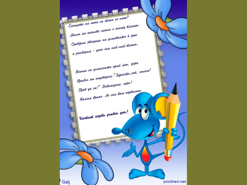 Ключови фрази: картичка пожелание послание мишле цветя моливче първолаче