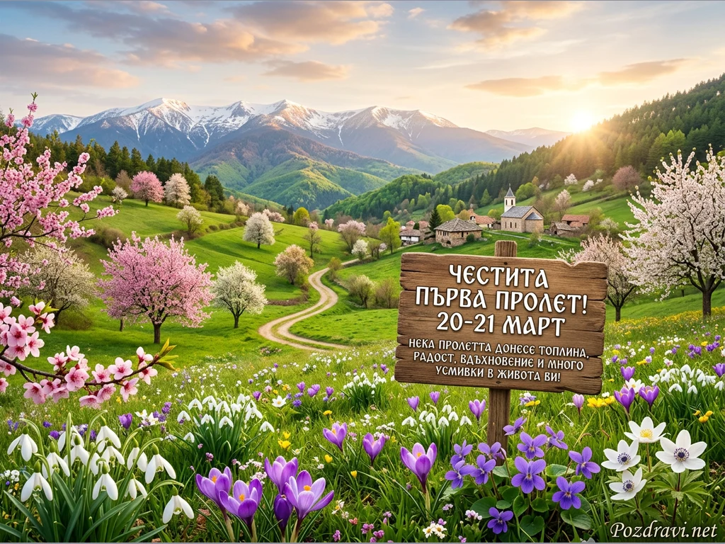 Живописен пролетен пейзаж разкрива зелени хълмове, осеяни с цъфтящи розови и бели дървета, водещи към малко селце с църква. На заден план се издигат величествени заснежени планини под небе, обагрено от изгрев или залез. Предният план е изпълнен с разноцветни пролетни цветя – кокичета, минзухари и теменужки. В центъра е поставен дървен надпис 'ЧЕСТИТА ПЪРВА ПРОЛЕТ! 20-21 МАРТ', придружен с пожелание за топлина, радост, вдъхновение и усмивки.