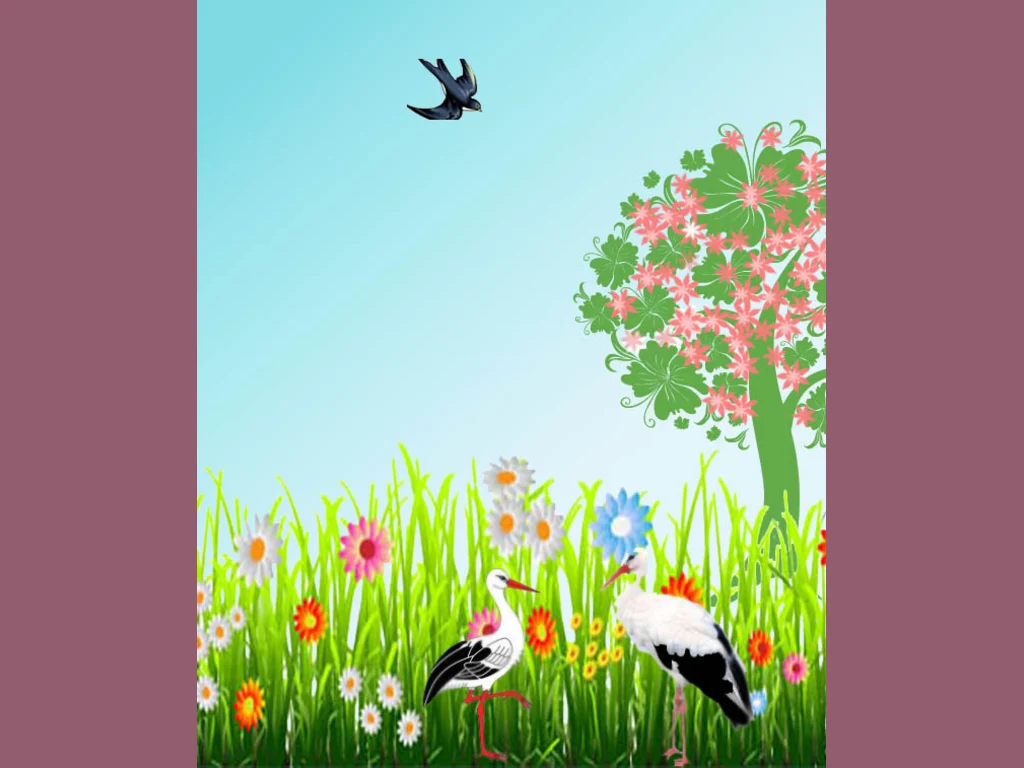 Ключови фрази: Картичка пролетен пейзаж слънце поляни щъркели дошли цветя цъфнали клонки дървета зеленина маргаритки лястовици нов живот красота поздрави пожелание любов