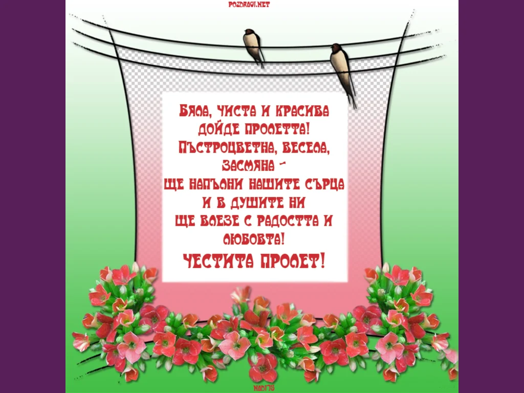 Ключови фрази: Честита пролет мила моя красива картичка засмяна раждаща нов живот любов радост щастие оптимизъм огледало жена щастлива магнетична букет цветя панделка разцъфнали рози пеперуда
