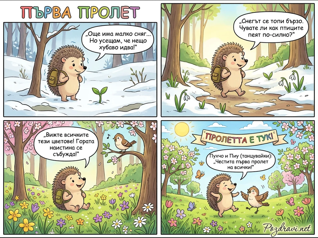 Комиксът 'Първа пролет' проследява пътешествието на усмихнат таралеж с раница през гората, докато природата се събужда. Започвайки от заснежен пейзаж с първи кълнове, той наблюдава топенето на снега и появата на кокичета. Постепенно гората се изпълва с цъфтящи дървета и пъстри цветя, а птичките пеят радостно. В последната сцена таралежът и птичката танцуват щастливо, празнувайки настъпването на пролетта.