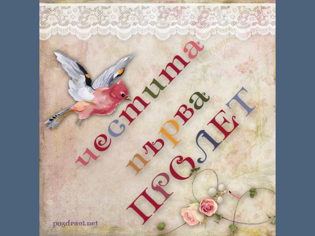 Пролет Първа пролет- 20/03 - 21/03 Създадена: 2017-03-18 14:36:18 Честита първа пролет. Картичка с птиче и роза Ключови фрази: славей букет венец от рози Оригинална снимка