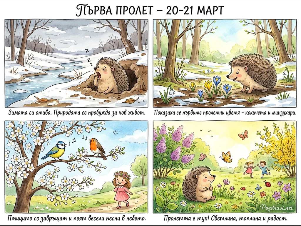 Картината показва четири сцени, илюстриращи настъпването на пролетта, озаглавени 'Първа пролет – 20-21 МАРТ'. Започва със събуждащ се таралеж от зимен сън сред топящ се сняг, последван от появата на първите пролетни цветя като кокичета и минзухари. Следва сцена с пеещи птици по разцъфнало дърво и момиченце, което се радва на природата. Финалната сцена изобразява щастлив таралеж сред поляна с цветя, пеперуди и играещи деца, символизираща радостта и топлината на пролетта.