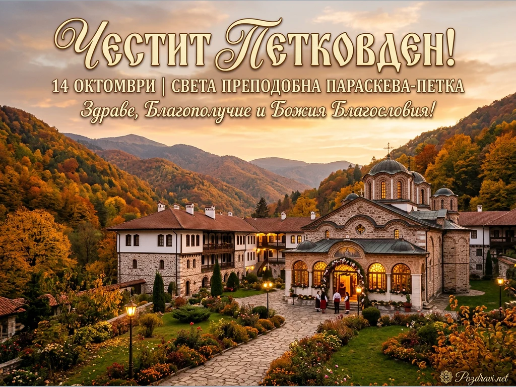 На картичката е изобразен живописен манастирски комплекс, разположен сред планински склонове, обагрени в ярки есенни цветове. Небето е озарено от мека златиста светлина, създаваща топла и спокойна атмосфера. Главната църква е с каменна фасада и куполи, а пред нея се виждат хора в народни носии и богато украсен вход. Добре поддържани градини с цветя и павирани алеи обграждат сградите, които са с традиционна архитектура и червени покриви. В горната част на картичката има надпис 'Честит Петковден! 14 Октомври | Света Преподобна Параскева-Петка Здраве, Благополучие и Божия Благословия!'.