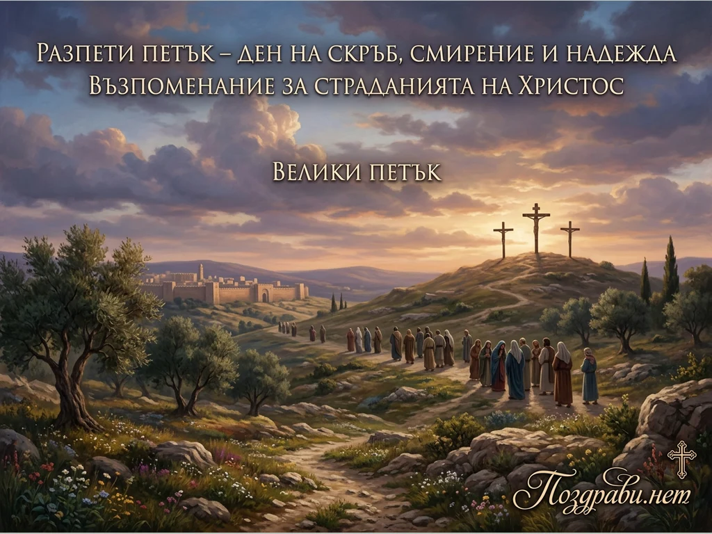 Картината изобразява библейски пейзаж с извит път, водещ към хълм, увенчан с три кръста, символизиращи Голгота. Множество хора в древни одежди вървят по пътя, някои приближават хълма, други са събрани в подножието му. На заден план се вижда укрепен град, вероятно Йерусалим, под драматично небе с облаци в нюанси на залез. Предният план е изпълнен с маслинови дървета, скали и диви цветя, създаващи атмосфера на смирение и възпоменание.