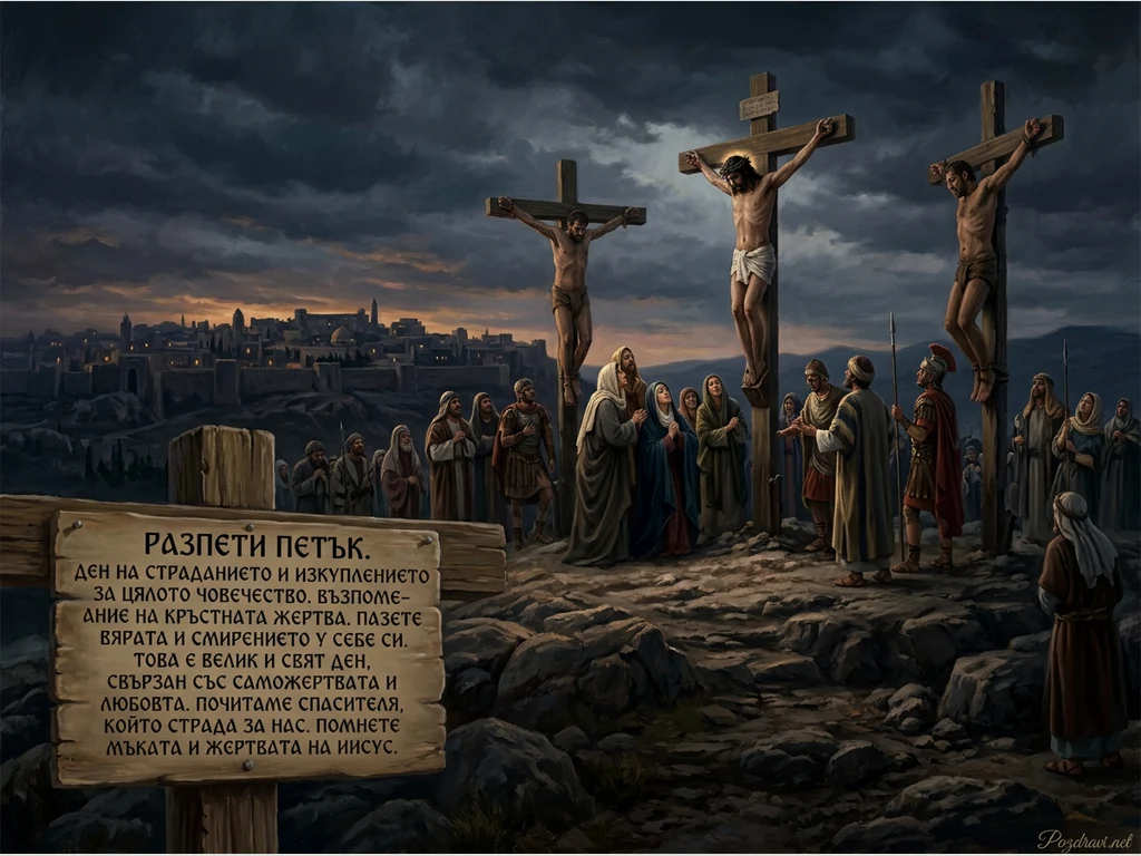 Тази картина изобразява Разпятието на Исус Христос на Голгота, където Той е разпънат между двама други мъже. В подножието на кръстовете се е събрала тълпа от хора, включително скърбящи жени и ученици, които наблюдават трагичната сцена. На заден план се вижда древният град Йерусалим под драматично, буреносно небе, което подчертава мрачната атмосфера на Разпети петък. В преден план има дървена табела с текст на български, обясняващ значението на този велик и свят ден на страдание и изкупление. Цялостната композиция предава дълбоко чувство на скръб, жертва и духовно размишление.