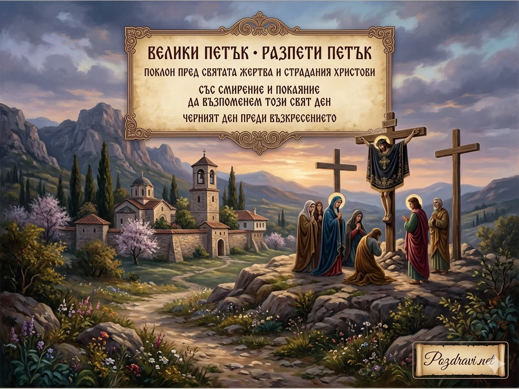 Тази красива картичка за Разпети петък изобразява дълбоко трогателна библейска сцена на разпятието. В горната част, в елегантна рамка, е изписано послание, което ни напомня за жертвата и страданията на Христос: 'ВЕЛИКИ ПЕТЪК – РАЗПЕТИ ПЕТЪК. ПОКЛОН ПРЕД СВЯТАТА ЖЕРТВА И СТРАДАНИЯ ХРИСТОВИ. СЪС СМИРЕНИЕ И ПОКАЯНИЕ ДА ВЪЗПОМЕНЕМ ТОЗИ СВЯТ ДЕН. ЧЕРНИЯТ ДЕН ПРЕДИ ВЪЗКРЕСЕНИЕТО.'