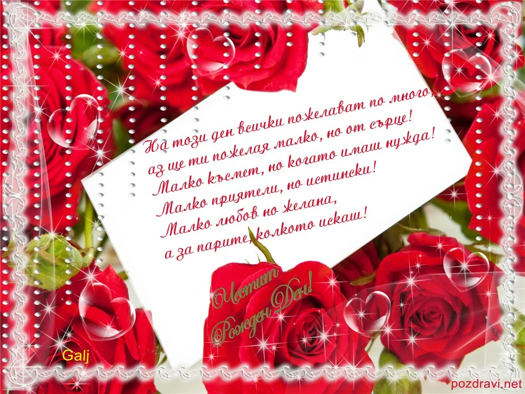 Ключови фрази: Картичка поздрави честит рожден ден пожелание алени червени рози сърчица перли диаманти
