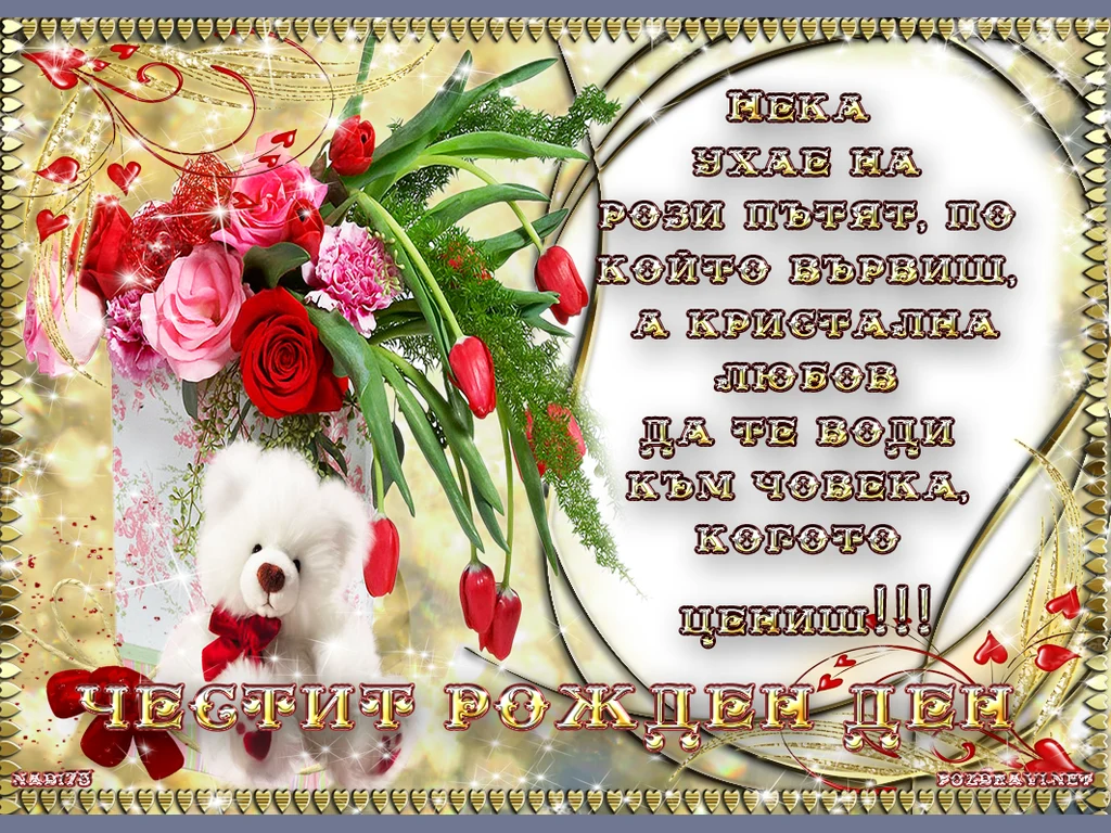 Ключови фрази: Картичка букет цветя розови алени рози червени лалета подарък плюшено мече кристална любов обичан ценен човек любим сърчица рожден ден пожелания