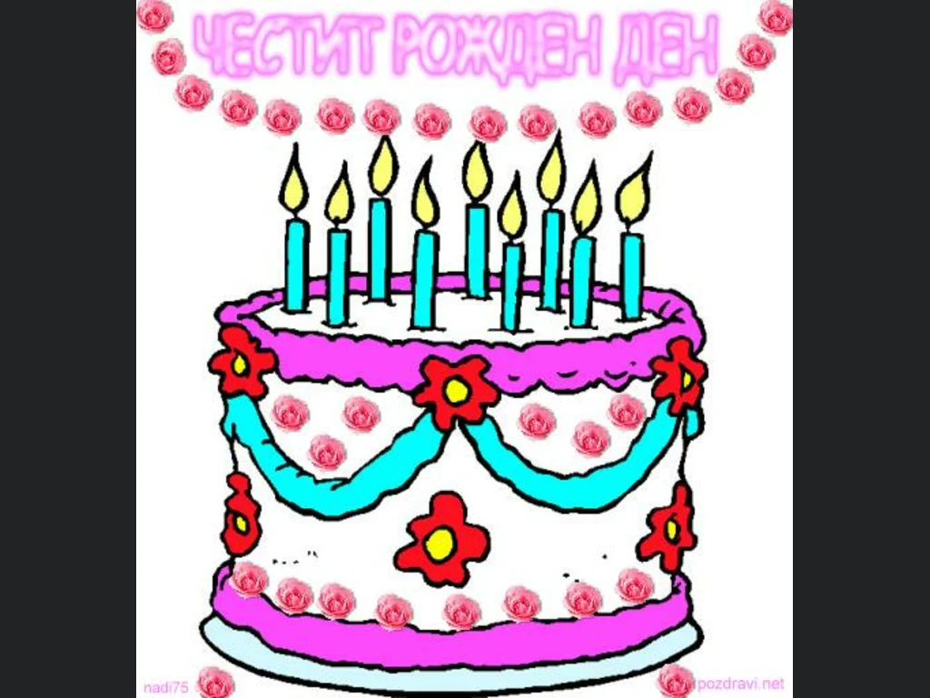 Ключови фрази: Рисувана картичка торта рожден ден пъстра окрасена розички сметана цветчета горящи свещички поздрави пожелание