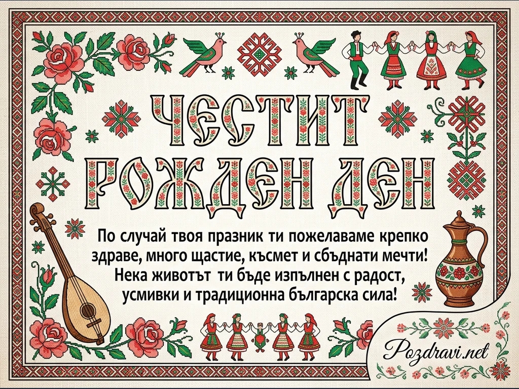 Поздравителна картичка в традиционен български стил, имитираща бродерия (шевица), с централен надпис 'ЧЕСТИТ РОЖДЕН ДЕН'. Около него са разположени разнообразни фолклорни мотиви, включващи червени рози, зелени листа, птици, геометрични орнаменти и хора, хванати на хоро. В долната част има пожелание за здраве, щастие и сбъднати мечти, както и изображения на тамбура и глинено гърне. Цялостният дизайн е изпълнен с ярки цветове и пресъздава автентична българска атмосфера, подходяща за празник.
