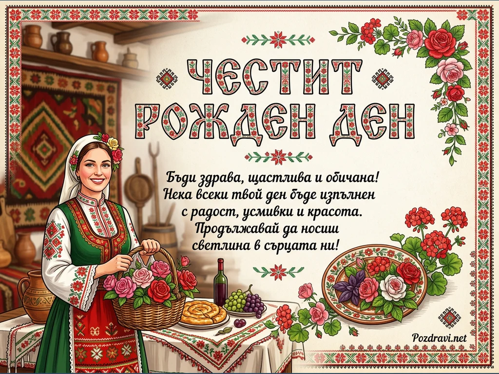 Тази празнична картичка за рожден ден е богато украсена с български фолклорни мотиви. В центъра е изобразена усмихната жена в традиционна българска носия, държаща кошница с розови рози. Тя стои до маса, отрупана с баница, грозде и бутилка вино, а на заден план се виждат глинени съдове и шарен килим. Надписът 'ЧЕСТИТ РОЖДЕН ДЕН' е изписан с декоративни букви, а под него има сърдечно пожелание. Цялостната композиция излъчва топлина, гостоприемство и дълбока почит към българските традиции.