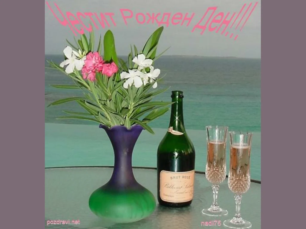 Ключови фрази: Картичка поздрави пожелание интимна среща рожден ден празнува бряг море маса вино розе наздравица букет цветя романтика любов красота