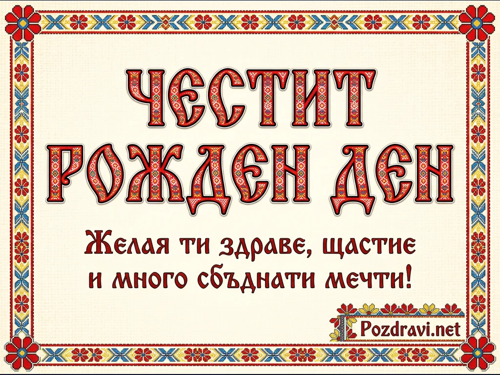 Картичка за рожден ден с традиционен български дизайн. Рамката е оформена от цветна шевица в червено, синьо, жълто и бяло, наподобяваща ръчна бродерия. В центъра на светъл, текстуриран фон е изписан надписът 'ЧЕСТИТ РОЖДЕН ДЕН' с букви, стилизирани като елементи от шевица. Под него има сърдечно пожелание: 'Желая ти здраве, щастие и много сбъднати мечти!'. В долния десен ъгъл е добавено логото 'Pozdravi.net'.