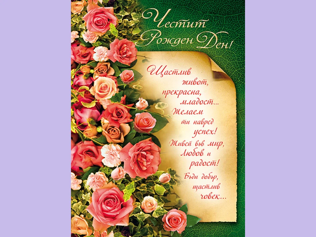 Честит Рожден Ден Щастлив живот, прекрасна младост... желаем ти навред успех! Живей във мир, любов и радост! Бъди добър щастлив човек ... Честит Рожден Ден!