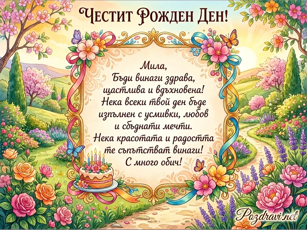 Картичката е цветна, празнична и изпълнена с пролетна атмосфера. Тя е с богата украса от разноцветни цветя като рози, лавандула и божури, които рамкират цялата композиция. В центъра има декоративна рамка в златист цвят, върху която се чете приветствие на български: 'Честит Рожден Ден!'. Вътре в рамката, на фона на свитък, е изписано пожелание за рожден ден с пожелания за здраве, щастие, вдъхновение, любов и сбъднати мечти. В долния ляв ъгъл на рамката има рождена торта с четири запалени свещички. До нея има малки сини пеперуди и розова панделка. Цялата сцена е на фона на живописен пейзаж с цъфнали дървета, поляна и пътека, която води към залязващото слънце.