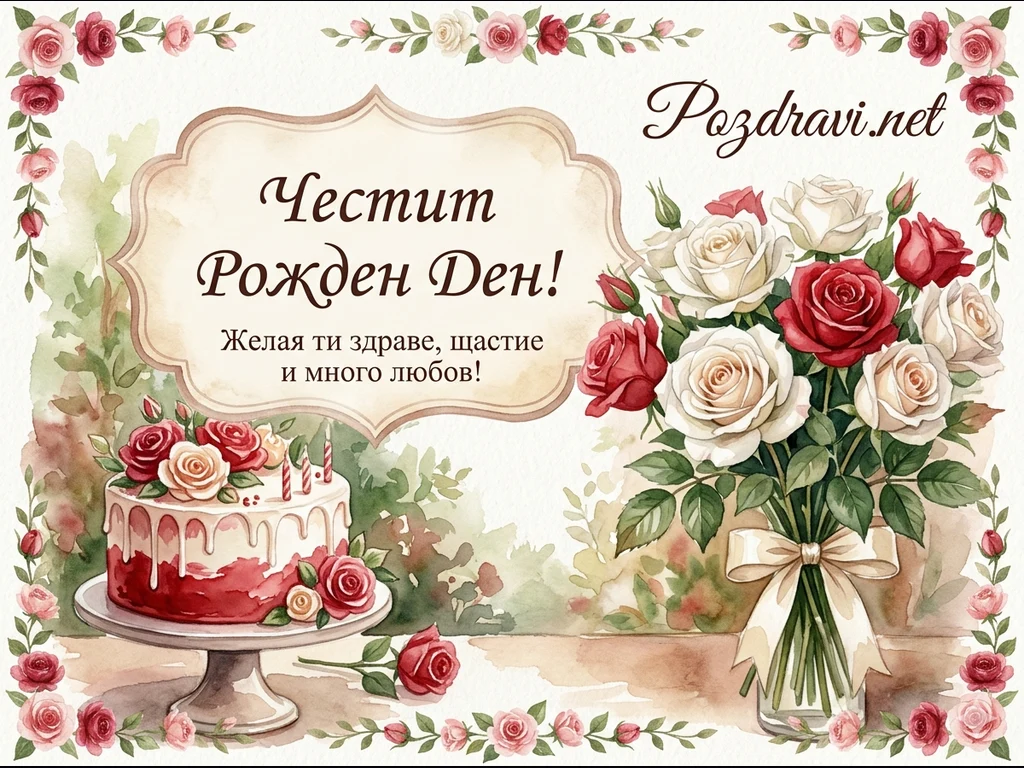 Тази красива акварелна поздравителна картичка е с пейзажно разположение. Тя има деликатна винтидж рамка от малки розови и червени рози и зелени листенца, която заобикаля цялата композиция. В центъра, в елегантна пергаментова рамка с красив шрифт, е изписано пожеланието: 'Честит Рожден Ден! Желая ти здраве, щастие и много любов!'. В горния десен ъгъл, с елегантен курсивен шрифт, е добавен надписът: Pozdravi.net. Вляво има красива и елегантна торта с бял и червен крем, украсена с рози и три запалени свещи, поставена на стилна поставка. Вдясно се вижда голям, пищен букет от бели и червени рози с красива панделка. Цялата картичка е изпълнена в нежни акварелни тонове, които създават усещане за празничност, елегантност и топлина.