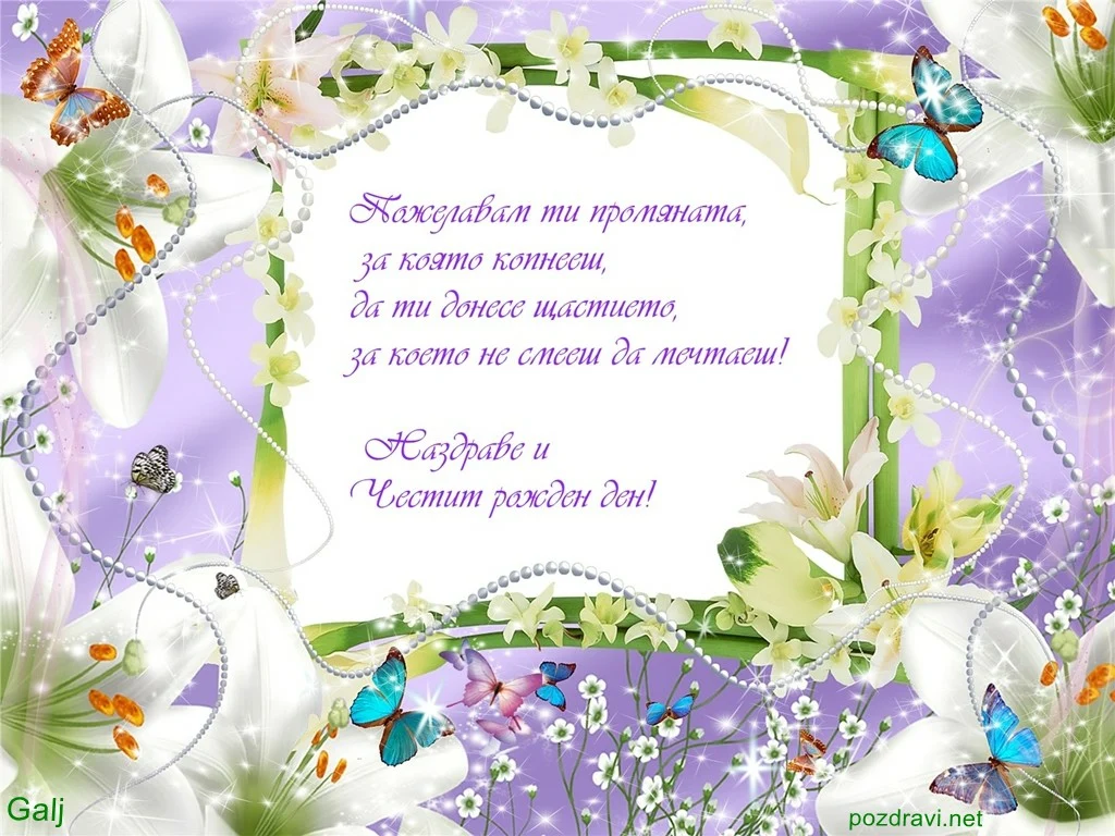 Ключови фрази: Весела пъстра картичка поздрави пожелание рожден ден нежни бели красиви цветя лилав фон разноцветни пеперуди перли огърлица диаманти красота мечти промяна щастие