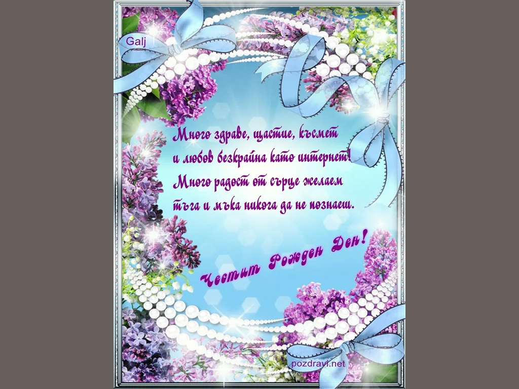 Ключови фрази: Слънчева лилава картичка пожелание рожден ден люляци наниз перли панделки изящество красота радост здраве щастие любов късмет
