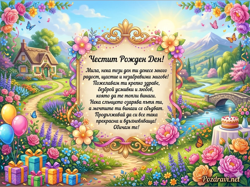 Тази приказна картичка пренася в вълшебен и цветен свят, изпълнен с радост и топлина. В центъра се откроява изящна златна рамка, богато украсена с нежни розови и лилави цветя и ефирни ленти. Вътре в нея, на фон от сияещи светлинки, е изписано милото пожелание: 'Честит Рожден Ден! Мила, нека този ден ти донесе много радост, щастие и незабравими мигове! Пожелавам ти крепко здраве, безброй усмивки и любов, която да те топли винаги. Нека слънцето озарява пътя ти, а мечтите ти винаги се сбъдват. Продължавай да си все така прекрасна и вдъхновяваща! Обичам те!'.