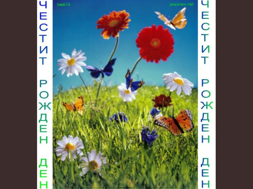 Ключови фрази: Картичка пожелание весели поздрави рожден ден пъстра полянка маргаритки гербери синчец пеперуди