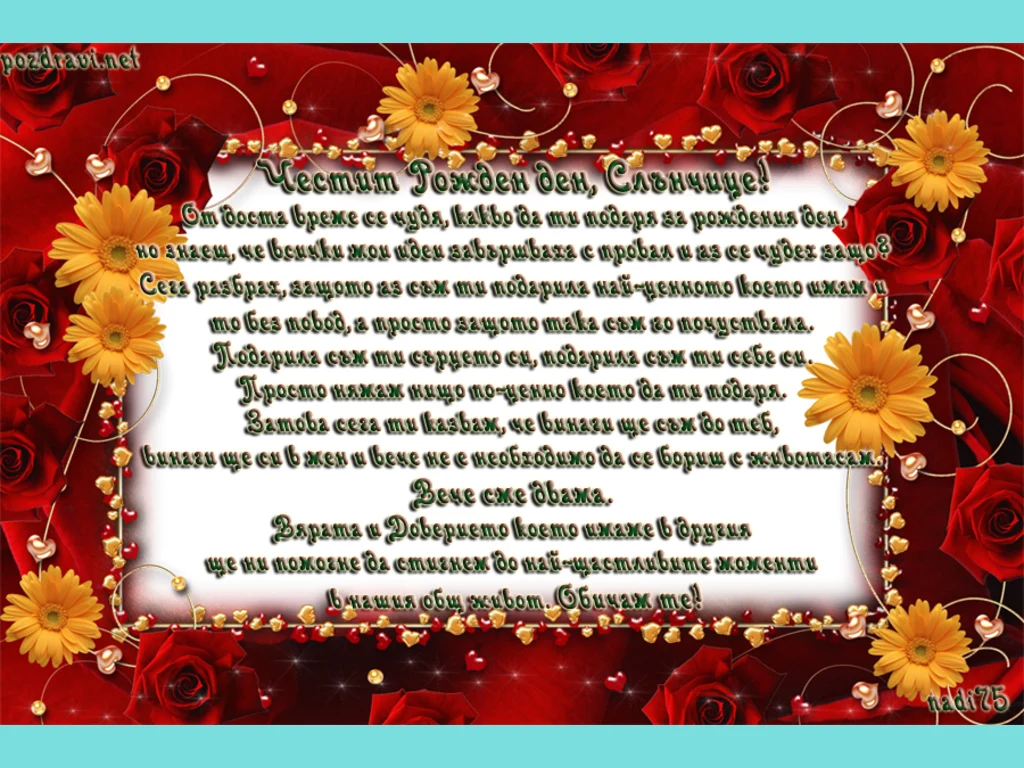 Ключови фрази: Картичка поздрави пожелание вяра доверие щастливи моменти общ живот обич вяра любов червени рози жълти гербери диаманти кристалчета перли