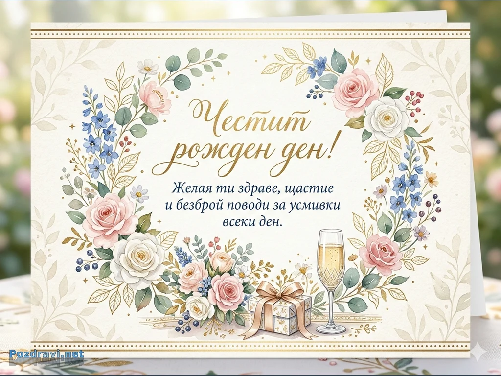 Заглавието 'Честит рожден ден!' е с едър златен калиграфски шрифт, а под него в тъмносиньо е пожеланието: 'Желая ти здраве, щастие и безброй поводи за усмивки всеки ден.'.