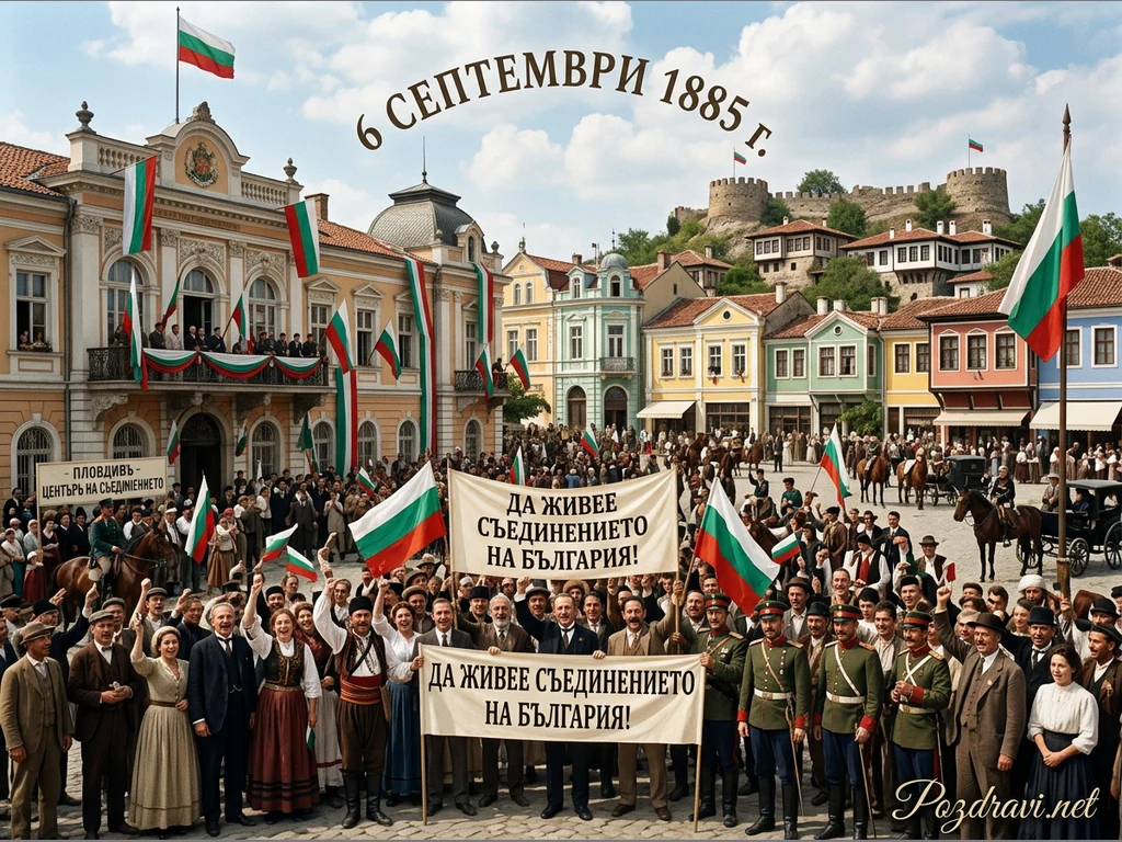 Тази възстановка пресъздава тържествена сцена от 6 септември 1885 г., когато е обявено Съединението на България. Централно място заема голяма група хора, облечени в автентични за епохата дрехи, включително военни униформи, народни носии и цивилни облекла. Те развяват български знамена и държат транспаранти с надпис 'ДА ЖИВЕЕ СЪЕДИНЕНИЕТО НА БЪЛГАРИЯ!'. На заден план се виждат празнично украсени сгради и историческа крепост на хълм, а в горната част е изписана датата '6 СЕПТЕМВРИ 1885 Г.'. Атмосферата е изпълнена с патриотизъм и празнично настроение, отразяващи значимостта на събитието.