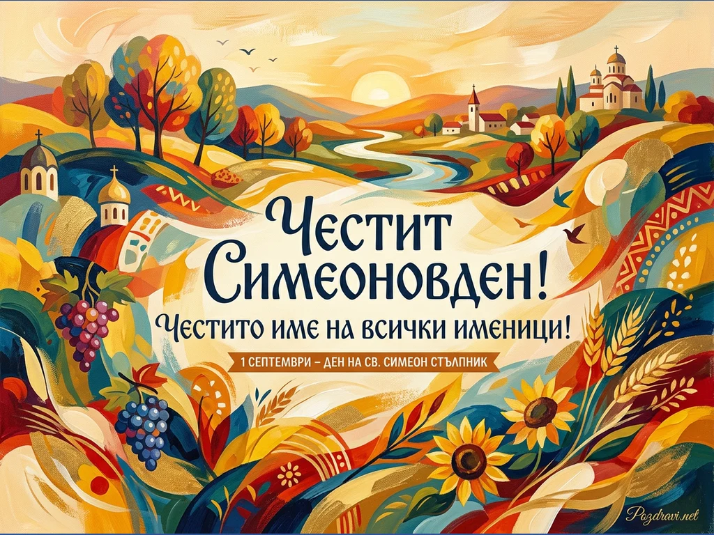 Тази ярка и стилизирана илюстрация изобразява живописен есенен пейзаж с хълмове, река и залязващо слънце. В композицията са включени църкви и къщи, разположени сред дървета с пъстри листа. Предният план е украсен с грозде, житни класове и слънчогледи, символизиращи плодородието и есенната реколта. В центъра на картичката е изписан поздравът 'Честит Симеоновден! Честито име на всички именици!', както и датата '1 Септември – Ден на св. Симеон Стълпник'. Цялостният стил е наситен с топли цветове и напомня на народно изкуство.