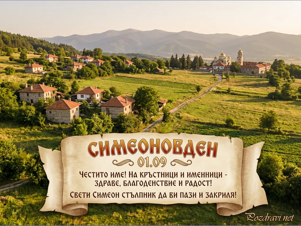Ключови фрази: Симеоновден картичка, Честит Симеоновден, Поздрави за имен ден, Български манастир, Селски пейзаж