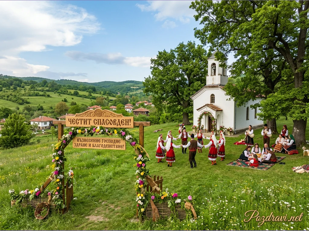 Снимката улавя живописна българска сцена, изпълнена с празнична атмосфера. В преден план се вижда богато украсена с цветя дървена арка с надпис 'ЧЕСТИТ СПАСОВДЕН! ВЪЗНЕСЕНИЕ ГОСПОДНЕ ЗДРАВЕ И БЛАГОДЕНСТВИЕ!'. Пред бяла църква с камбанария, заобиколена от буйни дървета, хора в традиционни носии играят хоро, докато други са се събрали на пикник. Заден план разкрива зелени хълмове и къщи, създавайки идилична картина на българско село под ясно небе.
