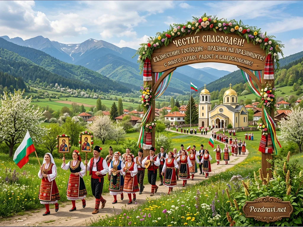 Живописна сцена от българско село показва празнично шествие на хора в традиционни народни носии. Те вървят по черен път, носейки български знамена и икони, на фона на разцъфнала пролетна природа. В далечината се вижда красива жълта църква със златни куполи, заобиколена от къщи и зелени хълмове, преливащи в планински върхове. Сцената е оформена от богато украсена дървена арка с надпис 'ЧЕСТИТ СПАСОВДЕН!', символизираща Възнесение Господне.