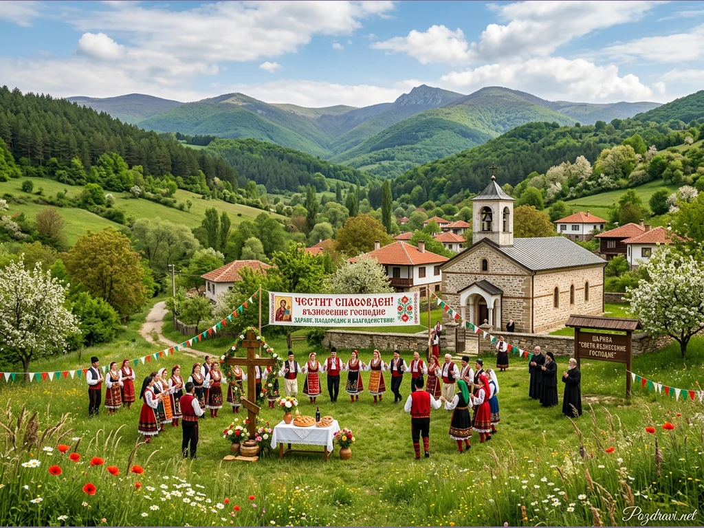 На снимката е запечатан живописен български пейзаж, където се празнува Спасовден. В центъра на зелена поляна, обградена от цъфтящи макове и диви цветя, група хора в традиционни носии играят хоро около украсен дървен кръст и маса с обредни хлябове. На заден план се виждат старинна каменна църква с камбанария, характерни селски къщи с керемидени покриви и тучни зелени хълмове, обгърнати от планини под ясно синьо небе. Празничният транспарант и облеклото на участниците подчертават съхранените български обичаи и връзката с природата.
