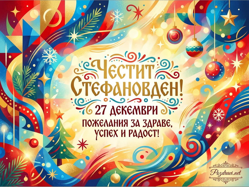 Тази празнична картичка отбелязва Стефановден с богата и цветна композиция. Фонът е изпълнен с абстрактни, вихрени форми в нюанси на червено, синьо, златно и зелено, украсени със снежинки, звезди и коледни топки. В центъра е изписано 'ЧЕСТИТ СТЕФАНОВДЕН! 27 ДЕКЕМВРИ ПОЖЕЛАНИЯ ЗА ЗДРАВЕ, УСПЕХ И РАДОСТ!' със златисти, орнаментирани букви. Малка коледна елха и други празнични елементи допълват веселото и топло настроение на зимния празник.